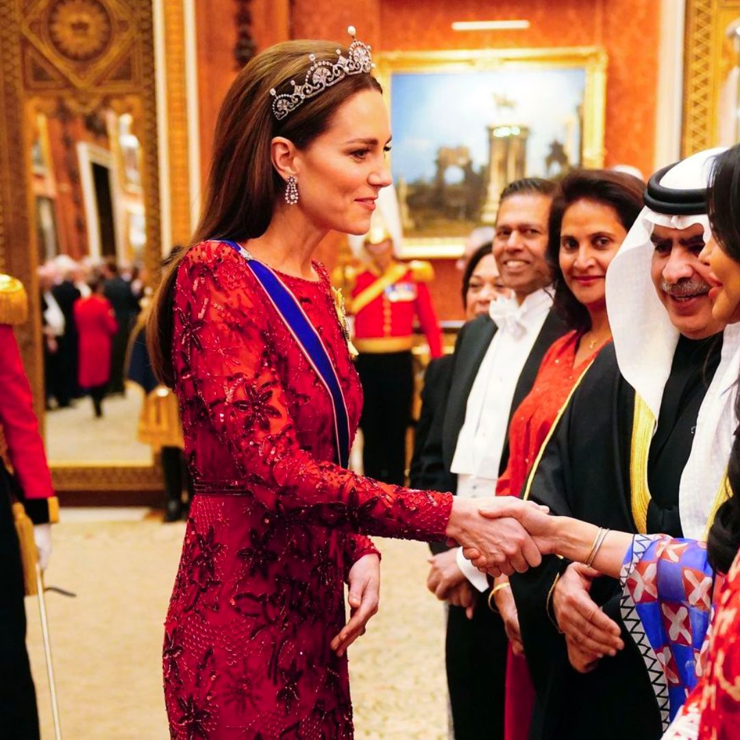 STEAL THE SHOW! All Eyes On Catherine In Jenny Packham Glittering Pink Gown and Queen’s Iconic Jewelry Set At Tea Party At Buckingham Palace